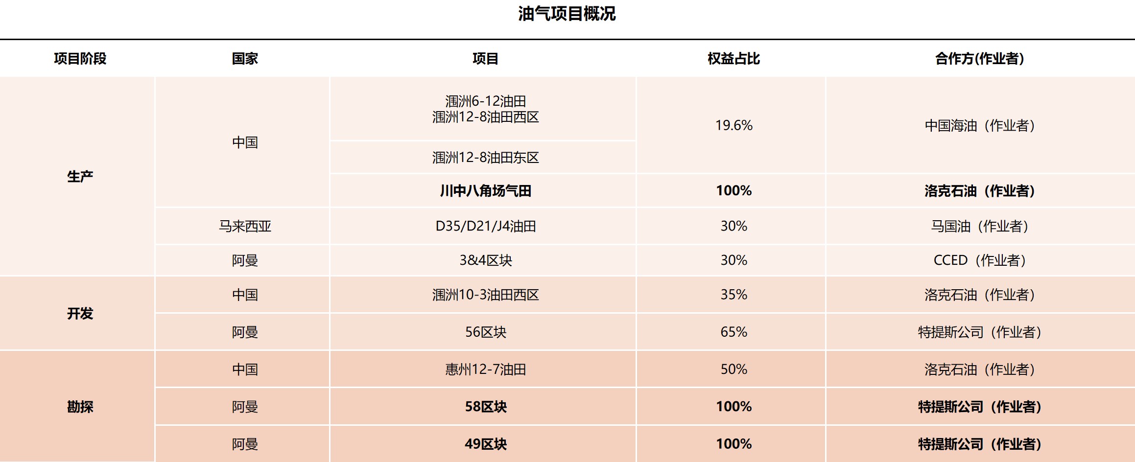 目前主要油气项目位于中国四川、南海西部北部湾、南海东部珠江口、马来西亚以及阿曼等地,目前日均油气产量超过3万桶当量。